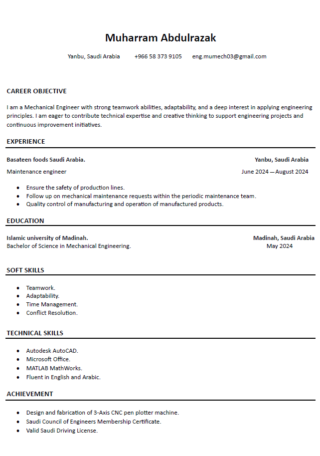 مهندس ميكانيكي حديث تخرج ابحث عن فرصة مناسبة لتنمية مهاراتي واكتساب الخبرات الميدانية والمكتبية، من مهاراتي التأقلم والعمل في فريق وتنظيم الوقت، حاصل على عضوية الهيئة السعودية للمهندسين