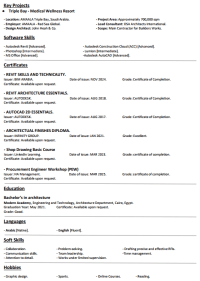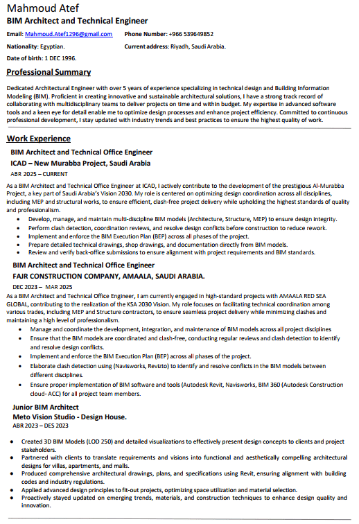 مهندس معماري متخصص في أل BIM ابحث عن فرصة عمل ك BIM Architect & Technical Office Engineer، حيث يمكنني توظيف خبرتي ومهاراتي في نمذجة معلومات البناء والتنسيق الفني للمساهمة في تنفيذ مشاريع عالية الجودة وفعالة تقنيا. امتلك خبرة قوية في التصميم المعماري، اعداد النماذج ثلاثية الأبعاد، والتنسيق بين مختلف التخصصات الهندسية (Architecture, Civil, Steel Structure, MEP) مع القدرة على اكتشاف وحل التعارضات (Clashes)