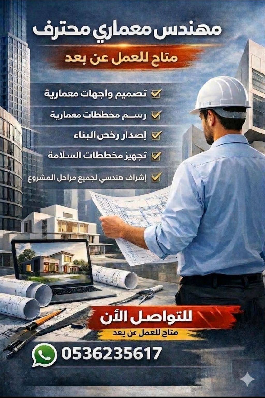 مهندس معماري حاصل على درجة الماجستير في الهندسة المعمارية تخصص إدارة المشاريع الهندسية، خبرة أكثر من 10 سنوات في التصميم والاشراف وإدارة المشاريع، أقدم خدمات هندسية متكاملة وفق الأنظمة المعتمدة في مدينة الرياض. الخدمات المقدمة اعداد التصاميم الهندسية المعمارية (سكني تجاري استثماري) الاشراف الهندسي على المشاريع ومتابعة التنفيذ رفع التقارير الهندسية للبلدية وأمانة الرياض اصدار رخص البناء النظامية