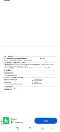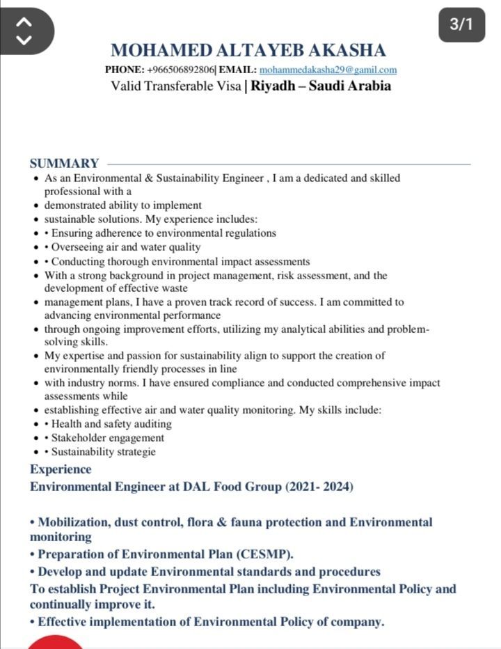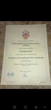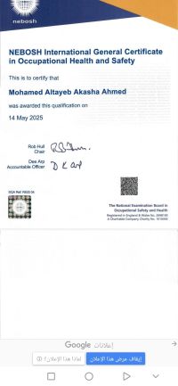 أنا مهندس محمد الطيب عكاشه سوداني الجنسية خريجه بكالوريوس هندسة كيميائية وعندي خبرة سنتين في المملكة العربية السعودية وعندي شهادة نيبوش وأيوش في مجال الصحة والسلامة المهنية