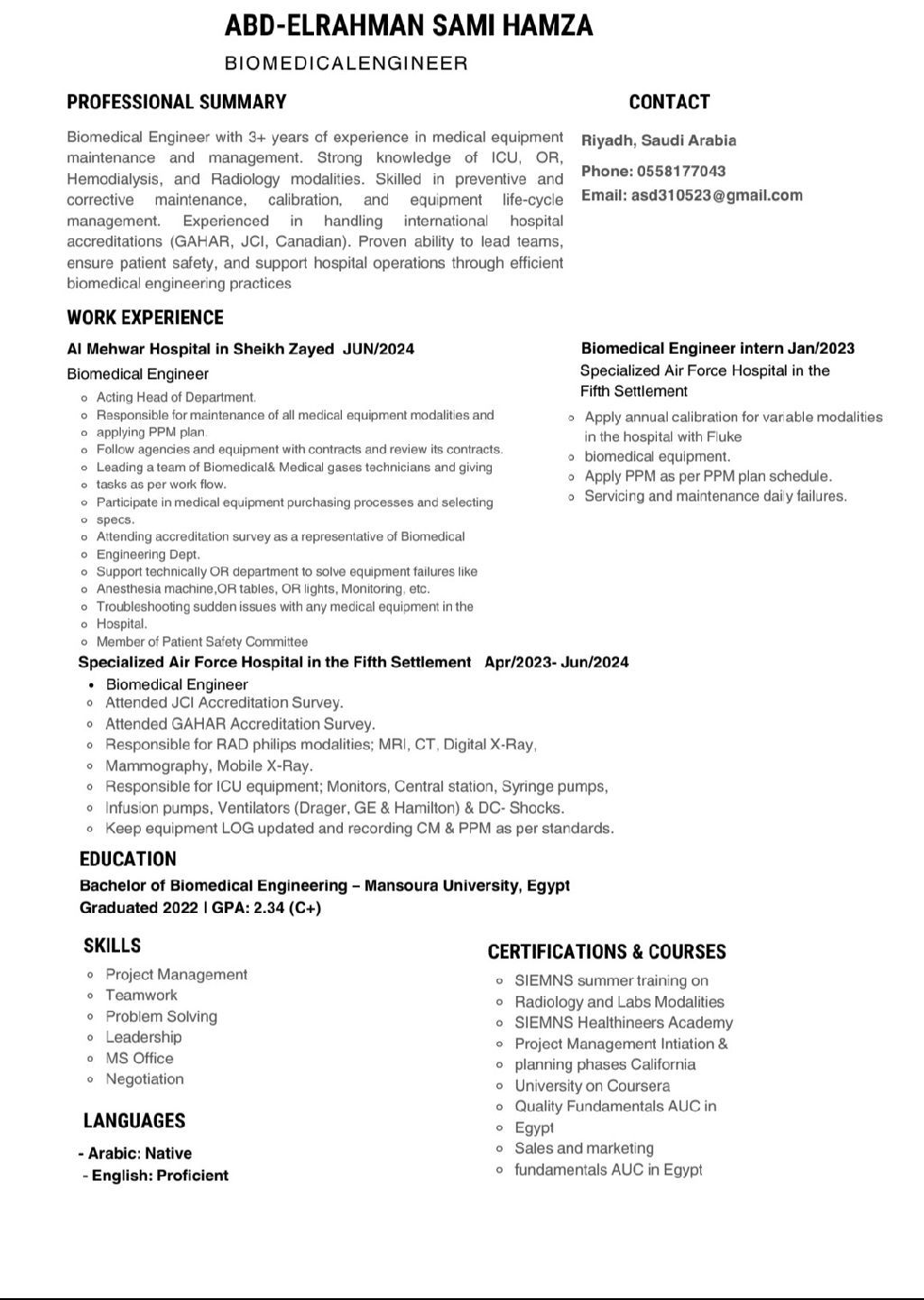مهندس اجهزة طبية مصري مقيم في الرياض معي إقامة قابلة للنقل وجاهز للبدء الفوري، بخبرة عملية تتجاوز 3 سنوات في صيانة وإدارة الاجهزة الطبية الحيوية داخل المستشفيات الكبرى (ICU, OR, Radiology) متخصص في برامج الصيانة الوقائية والتصحيحية، وضمان الامتثال الصارم لمعايير الجودة والاعتماد الدولي (مثل GAHAR وJCI) ابحث عن فرصة عمل مناسبة لخبرتي في المملكة العربية السعودية