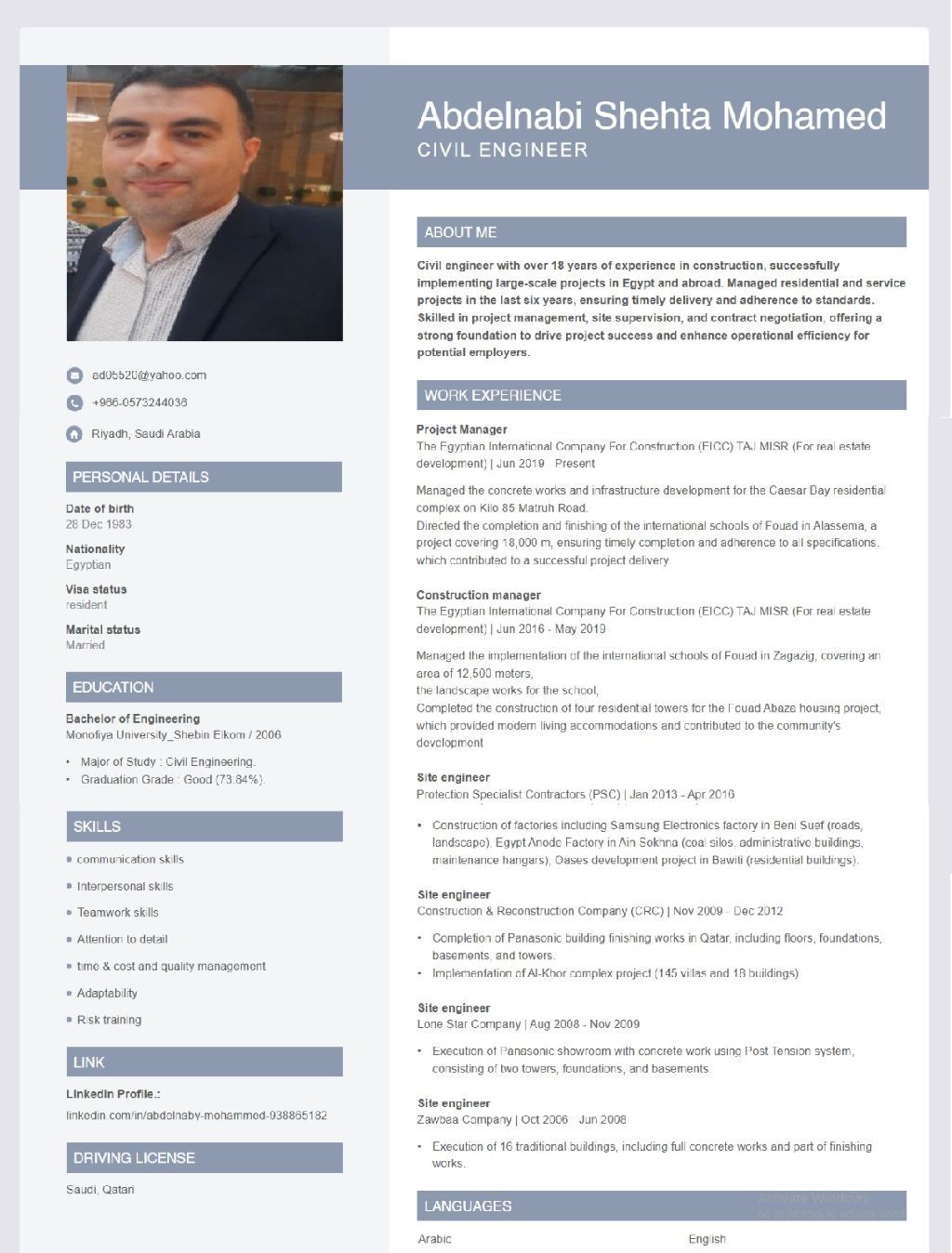مهندس مدني خبرة 18 سنة بالأعمال الانشائية والبنية التحتية والاشراف والتنفيذ لكثير من المشروعات السكنية والادارية والمصانع ولدي القدرة على الإدارة والتطوير والزيادة الانتاجية بأقل تكلفة وأعلى جودة