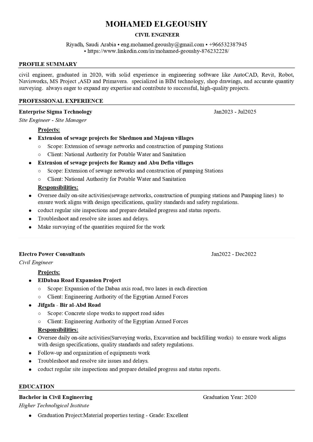 مهندس مدني مصري متواجد في الرياض خريج 2020 مسجل بالهيئة السعودية للمهندسين ولدي اقامة سارية لمدة عام ورخصة قيادة. لدي خبرة كبيرة في أعمال البنيه التحتية من شبكات الصرف الصحي (شبكات انحدار - وخطوط الطرد - ومحطات الرفع) وأعمال الخرسانات والتشطيبات وأعمال اللاند سكيب (في الدورة وانترلوك وخرسانة هيلكوبتر) وحصر الكميات وجاهز للعمل فورا في أي مكان في المملكة