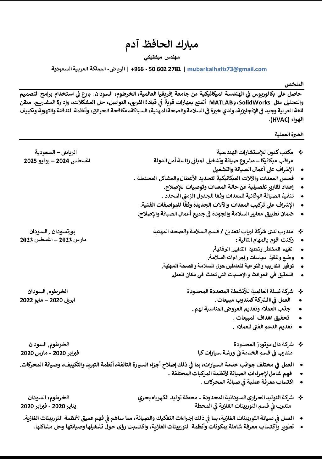 مبارك الحافظ مهندس ميكانيكي سوداني الجنسية مقيم في الرياض، خريج 2022 لدي معرفة بأنظمة خدمات المباني بما في ذلك أنظمة مكافحة الحريق والتكيف والسباكة والصرف الصحي. حاصل على شهادة IOSH في السلامة والصحة المهنية. لدي خبرة سنة في مشروع تشغيل وصيانة أتميز بالانضباط في العمل، والعمل ضمن فريق أسعى لفرصة عمل لتوظيف مهاراتي وخبراتي