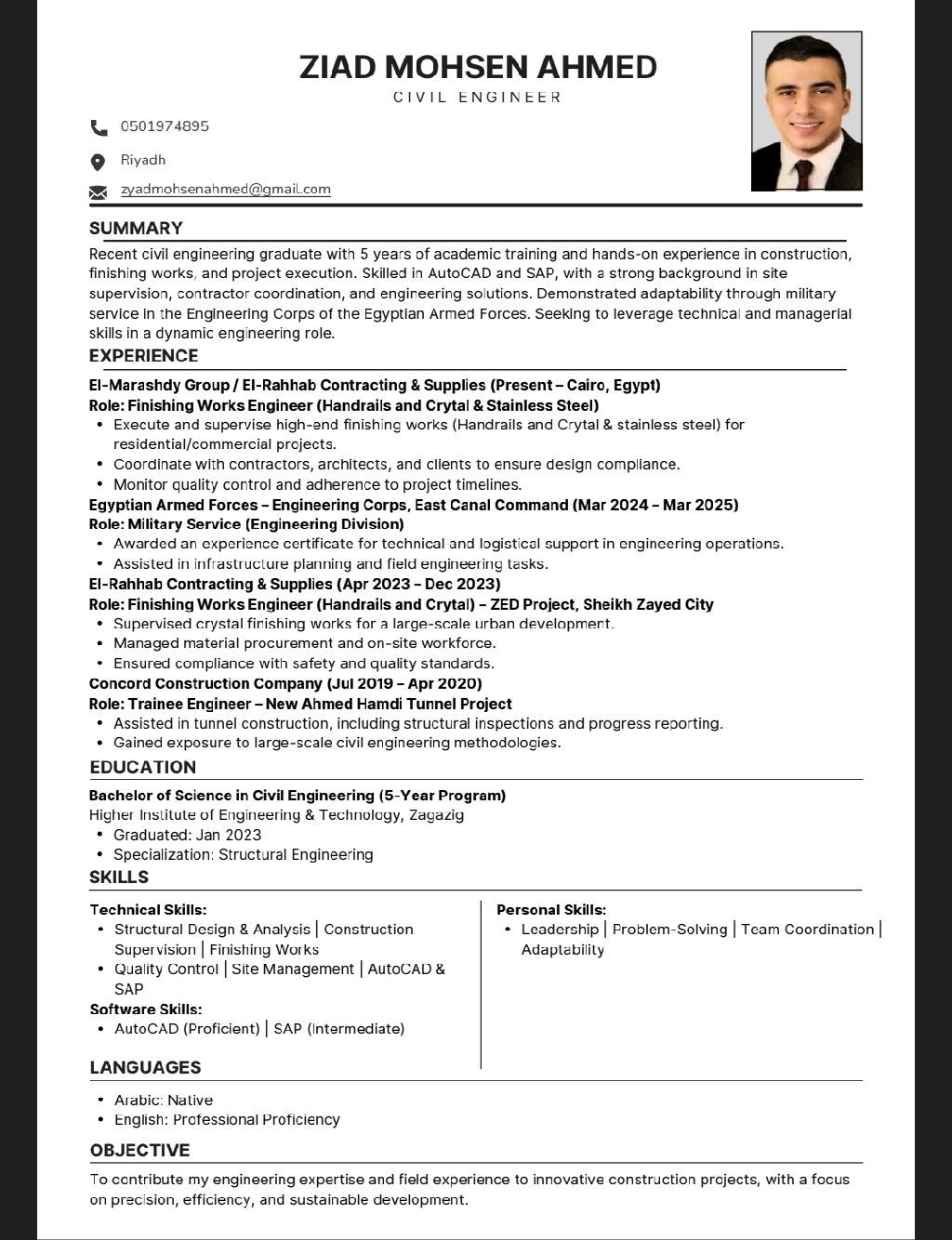 مهندس مدني خبرة 3 سنوات بالمقاولات في مصر / أجيد العمل على برامج الاوتوكاد والأكسيل وعمل حصر للكميات / ملم بالعمال التشطيبات وأعمال الخرسانات واستلام البنود وادارة الموقع والتعامل مع المقاولين / أيضا ملم بأعمال خرسانات post tention/ أملك رخصة قيادة ونقل كفالة متواجد حاليا في الرياض حي الخليج