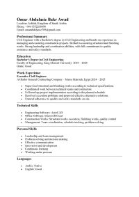 أنا. عمر عبدالعزيز بكر عوض مهندس مدني حاصل على بكالوريوس الهندسة المدنية من جامعة الملك مريوط، 2024 ولدي خبرة تنفيذية في المشاريع الانشائية واستخدام اجهزة المساحة (Total Station) ابحث عن فرصة عمل مناسبة في مجال الهندسة المدنية داخل المملكة العربية السعودية أتميز بالقدرة على تنفيذ الأعمال الانشائية والتشطيبات وفق المواصفات الفنية، والتنسيق بين الفرق الفنية، والالتزام بمعايير الجودة والسلامة