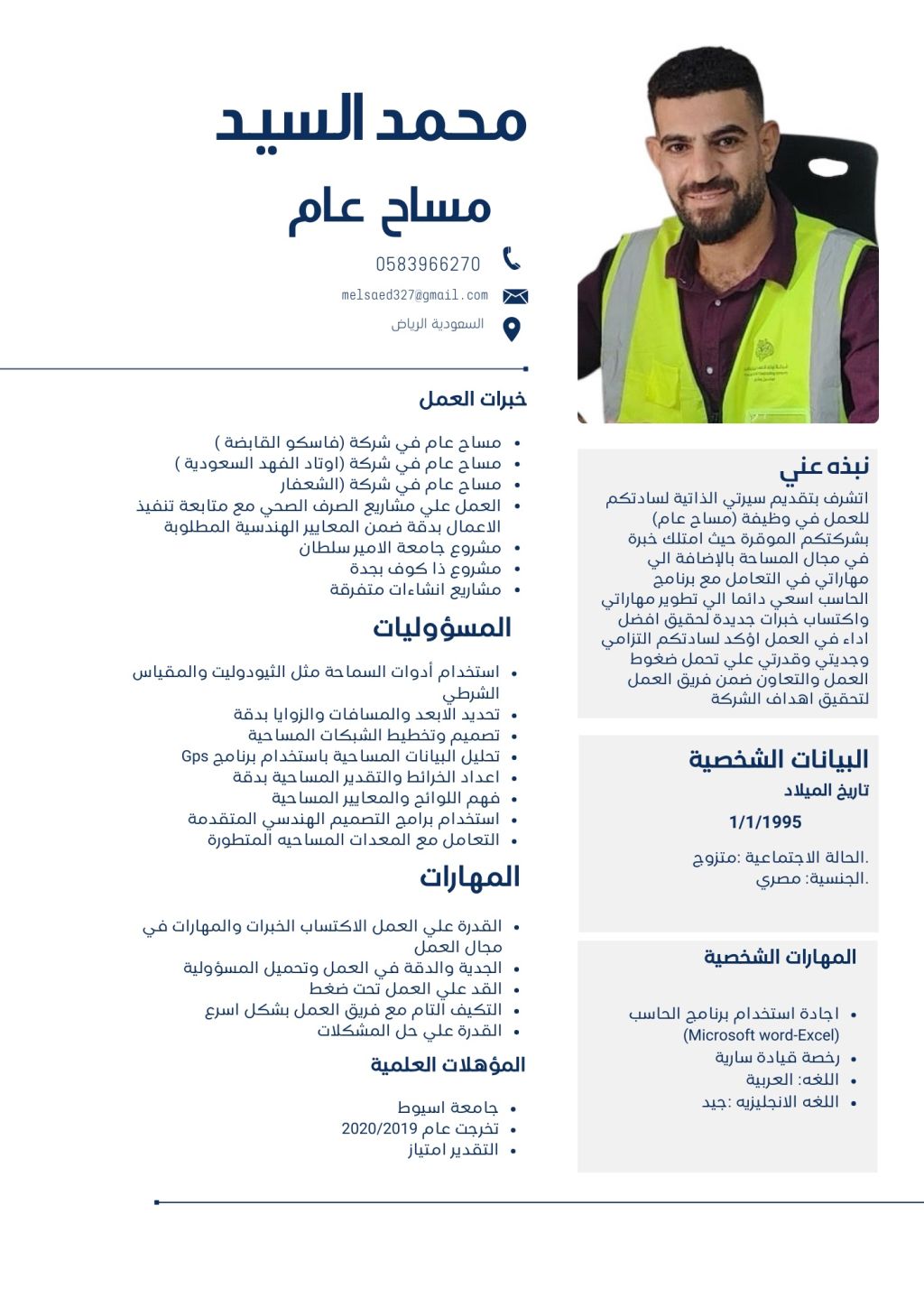 أتشرف بتقديم سيرتي الذاتية لسادتكم للعمل في وظيفة (مساح عام) شركة كم الموقرة حيث امتلك خبرة في مجال المساحة بالاضافة الى مهاراتي في التعامل مع برنامج الحاسب اسعي دائما الى تطوير مهاراتي واكتساب خبرات جديدة لحقيق أفضل أداء في العمل أؤكد لسادتكم التزامي وجديتي وقدرتي علي تحمل ضغوط العمل والتعاون ضمن فريق العمل لتحقيق أهداف الشركة