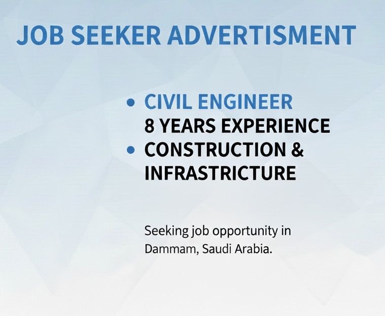 الى الشركات الرائدة في الدمام أنا مهندس مدني متخصص بخبرة 8 سنوات في دورة حياة المشاريع الهندسية من الأساسات (البنية التحتية) الى التفاصيل النهائية (التشطيبات) تخصص الإنشاءات، التشطيبات، ومشاريع الطرق والبنية التحتية وأعمال المكتب الفني ولوح الشوب دروينج وحصر الكميات وعمل المستخلصات الجاهزية متواجد حاليا في الدمام وجاهز لبدء العمل والمقابلات فورا