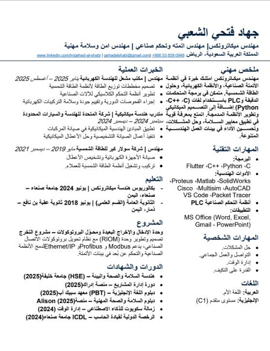 مهندس ميكاترونكس امتلك خبرة في أنظمة الاتمتة الصناعية، والأنظمة الكهربائية، وحلول الطاقة الشمسية متمكن في برمجة المتحكمات الدقيقة وPLC اضافة الى التصميم الميكانيكي وتطوير الأنظمة المدمجة أتمتع بمعرفة في تطبيق معايير السلامة، وحل المشكلات، وتحسين الأداء في بيئات العمل الهندسية المتنوعة