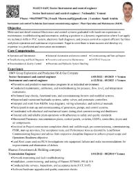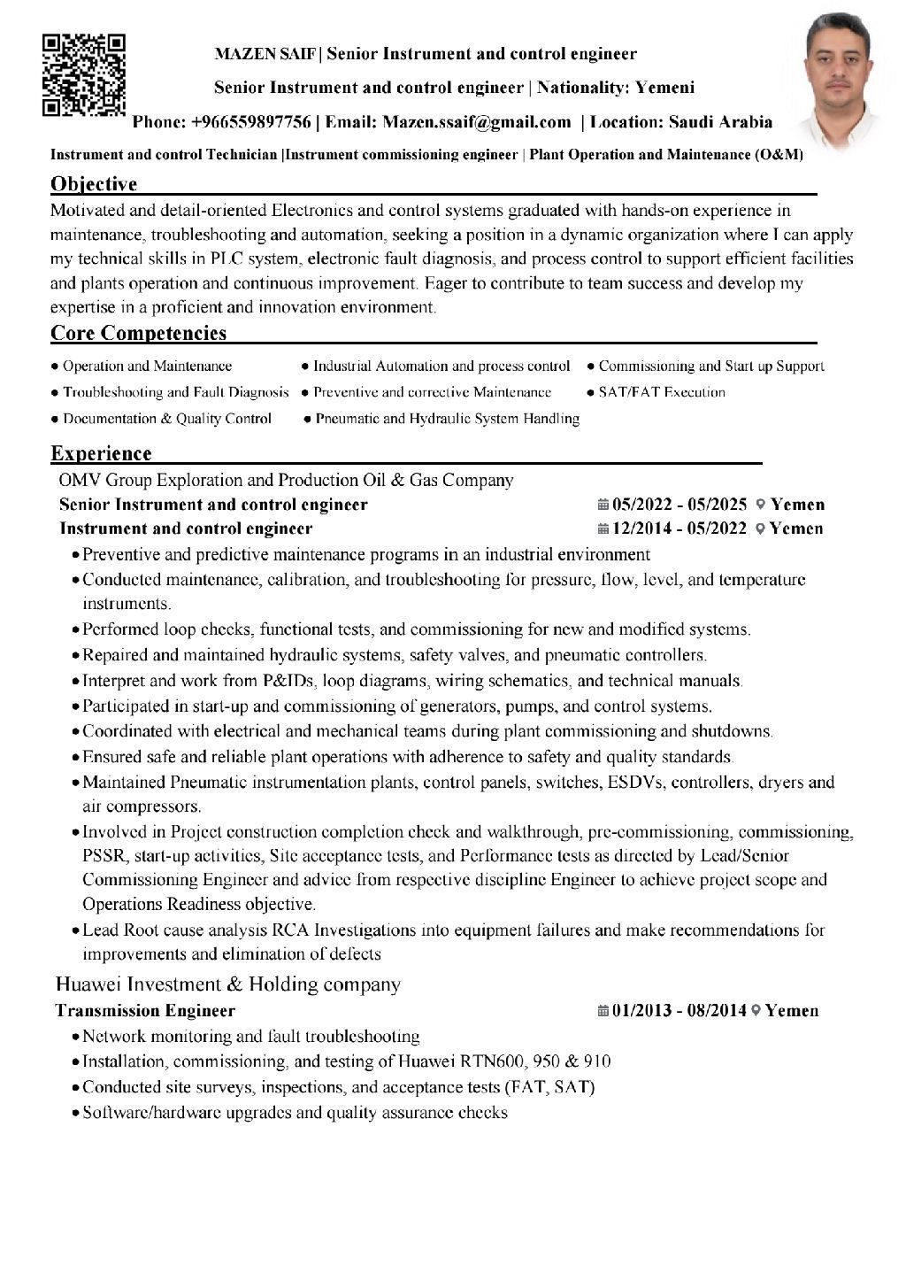 I am looking for a job opportunity as an instrumentation and control technician - an instrumentation and control technician with experience in the field of Industrial maintenance, work and calibration measurement in factories and power stations. Standards and maintenance of measuring devices (temperature - pressure - flow - level) loop inspection, operation, SAT/ FAT, PLC/ SCADA/ HMI systems