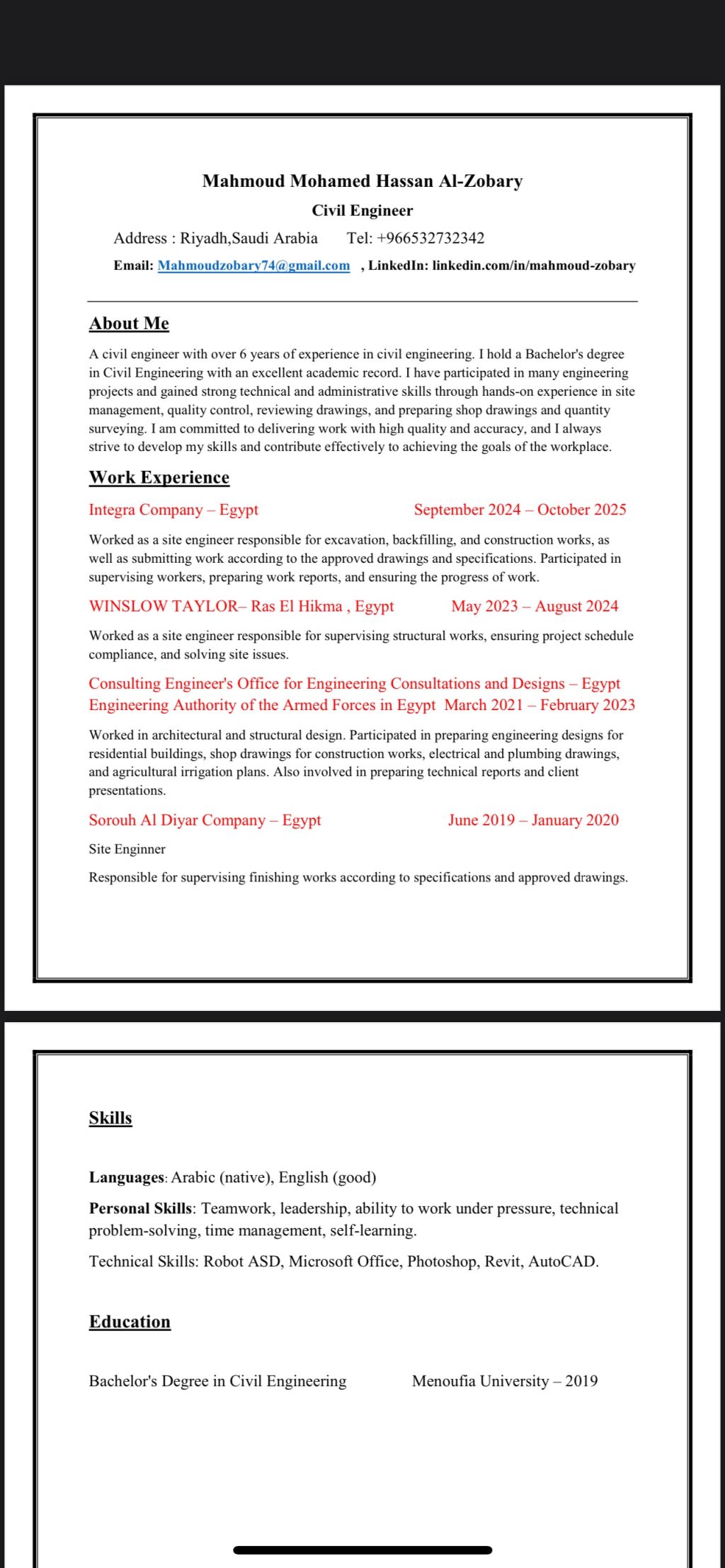 مهندس مدني تنفيذ وضبط جودة خبرة 6 سنوات في مجال الانشاءات والتشطيبات من الحفر والاحلال وأعمال التربة ومراحل العناصر الخرسانية الى جميع بنود التشطيبات حتى التسليم النهائي. أجيد البرامج الهندسيه مثل الاوتوكاد. أجيد استخراج مستخلصات المقاولين والحصر بالموقع والتنسيق بين جميع بنود التنفيذ وكافة الأعمال الورقيه. يوجد إقامة سارية مقيم في الرياض. يوجد اعتماد هيئة هندسيه. جاهز للعمل