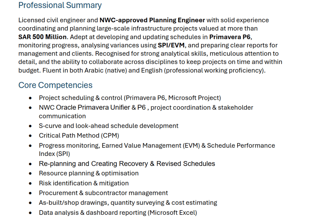 مهندس تخطيط معتمد من شركة المياه الوطنية خبرة باعداد الجداول الزمنية وتحميلها بالموارد والتكلفة ومتابعة التقدم واعداد التقارير اليومية والأسبوعية والشهرية وعمل داشبورد لمؤشرات الأداء وعمل جداول أل recovery & revised schedules بالاضافة لنظام اليونيفاير الخاص بال NWC ابحث عن شاغر ملائم في المدينة المنورة أو المنطقة الغربية