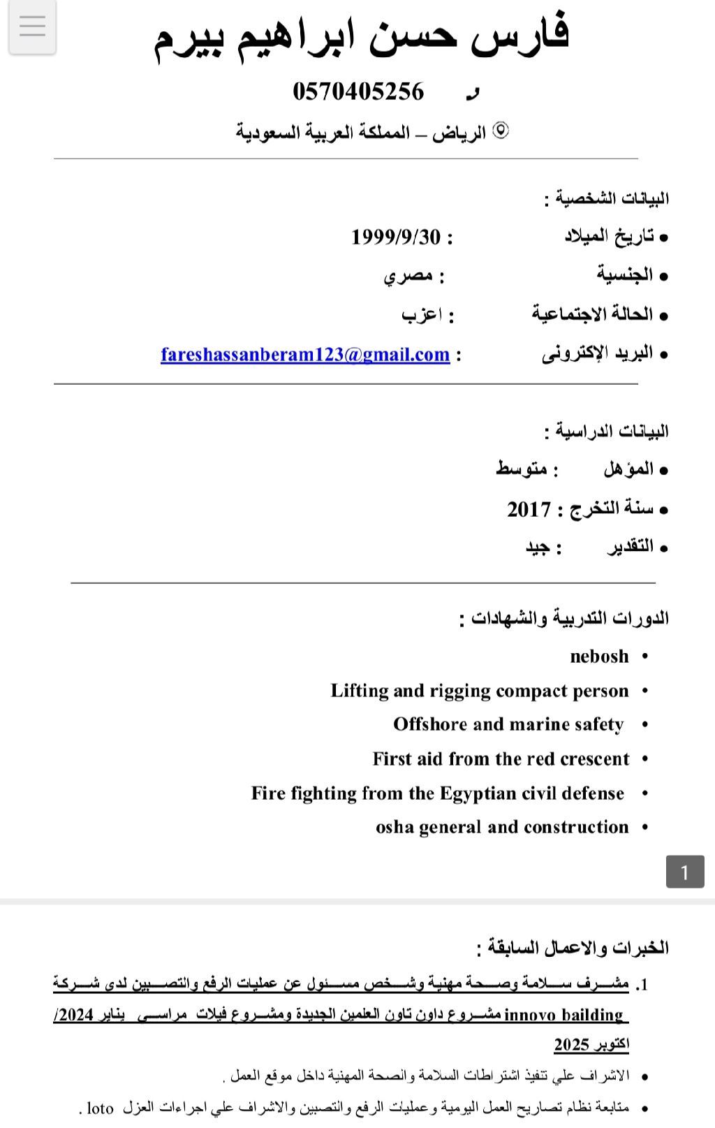 مشرف ومراقب أمن وسلامه مصري 26 عام خبرة أكثر من 6 سنوات في البنيه التحتية والانشاءات لدي من الشهادات والكورسات ما يؤهلني للعمل في هذه الوظيفة