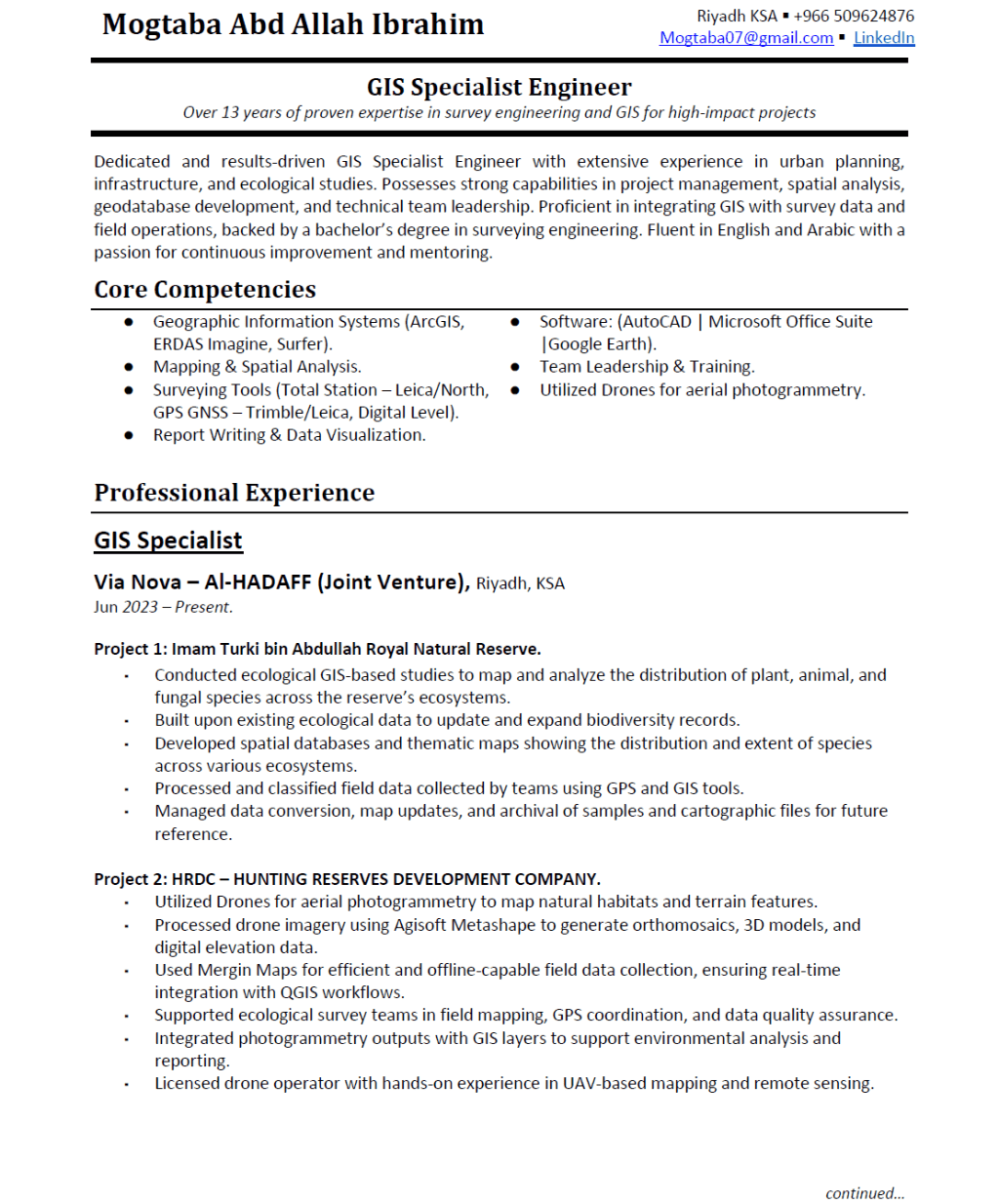 أخصائي نظم معلومات جغرافية (GIS Specialist) بخبرة تتجاوز 13 سنة في مجال نظم المعلومات الجغرافية وتطوير قواعد البيانات المكانية وانتاج الخرائط باستخدام ArcGIS وQGIS وERDAS، مع خبرة في الاستشعار عن بعد وتشغيل الطائرات بدون طيار UAV لانتاج أل Orthomosaic وال DEM وال 3D Models عبر Metashape، وخبرة في جمع بيانات الحقل عبر Mergin Maps، حاصل على بكالوريوس هندسة المساحة - تخصص GIS، ومسجل في الهيئة السعودية