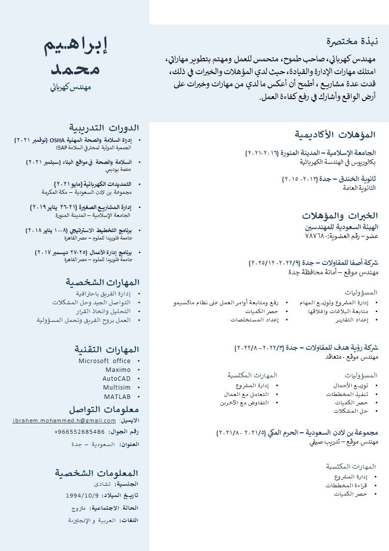 مهندس كهربائي - جدة مهندس كهربائي عضو في الهيئة السعودية للمهندسين مقيم ومولود في جدة اعمل حاليا مهندس موقع مقاول لدى أمانة جدة في مشروع صيانة وتشغيل تدربت في شركة بن لادن الحرم المكي وأشرفت أيضا على مشروع بناء مراكز صيانة لشركة كيا - جيتور حاصل على شهادة OSHA للسلامة