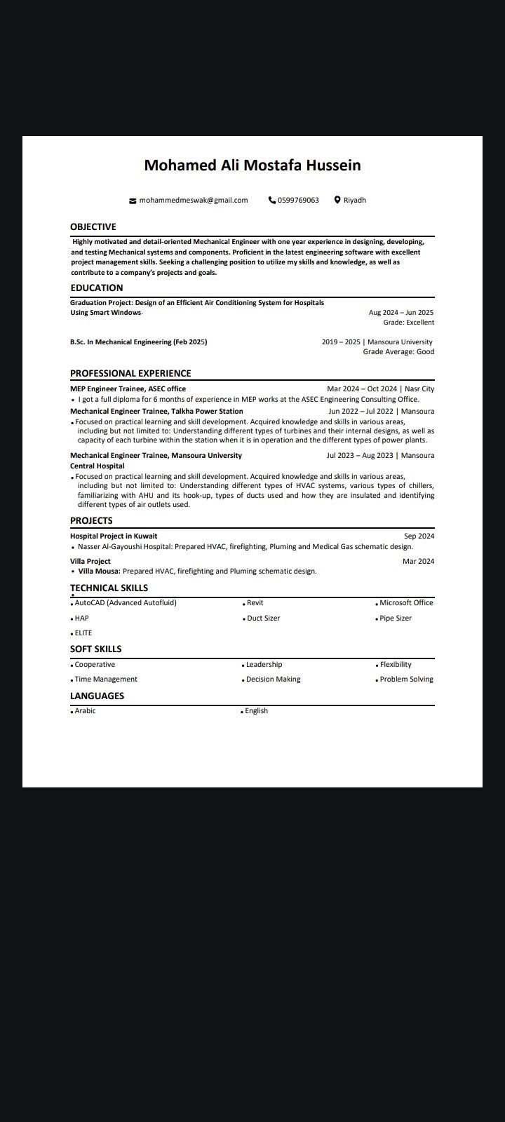 مهندس ميكاترونيكس حديث التخرج، خبرة في أعمال HVAC, Fire fighting, Pluming ابحث عن وظيفة في الرياض حالة الإقامة سارية وقابلة للنقل ولدي رخصة قيادة سارية