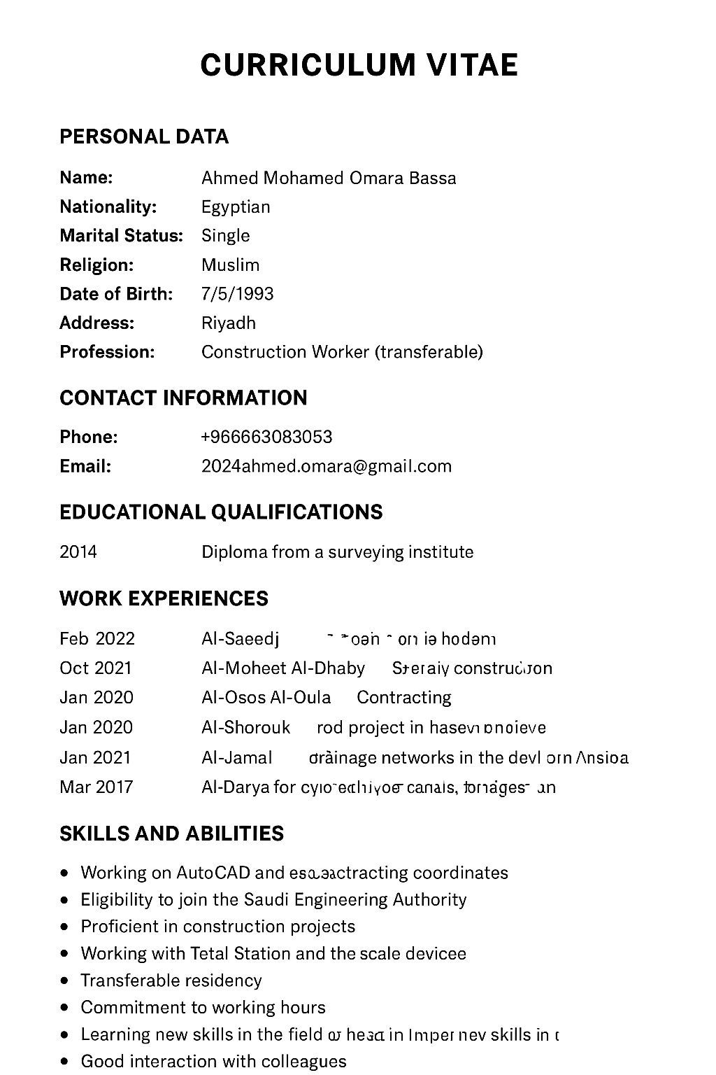 مساح - خبرة في الرفع والتوقيع المساحي يشرفني التقدم لوظيفة مساح، ولدي خبرة في أعمال الرفع المساحي والتوقيع، واستخدام اجهزة أل GPS وال Total Station، بالاضافة الى القدرة على العمل الميداني ضمن فريق عمل وتنفيذ المهام بدقة عالية. ابحث عن فرصة مناسبة للانضمام الى فريق محترف، وأنا جاهز للعمل فورا. شاكرين اهتمامكم