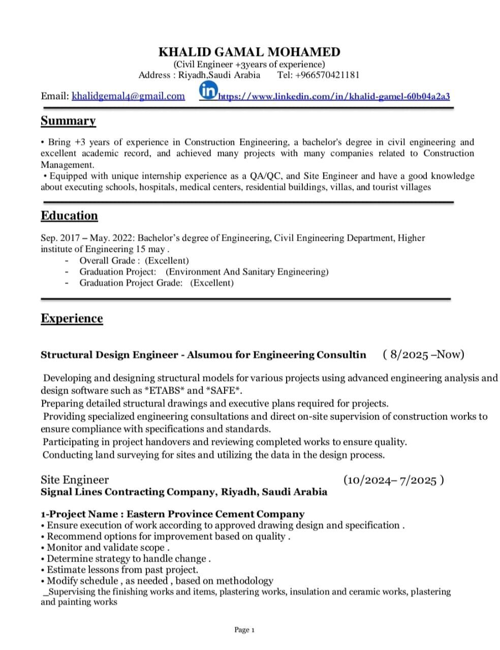 مهندس مدني مصري خبرة 4 سنوات تنفيذ اشراف وتصميم - مقيم في الرياض لدي خبرة في تنفيذ الأعمال الخرسانية والاشراف علي المواقع، بالاضافة الى خبرة قوية في العمل المكتبي 1 - تصميم انشائي علي برامج (AutoCAD SAFE - ETABS) 2 - اعداد النوتة الحسابية وتقارير التصميم 3 - خبرة في التعامل علي منصات (بلدي - الامانة - منصة عنان - البورصة العقارية) يوجد إقامة سارية ورخصة قيادة، للتواصل واتساب واتصال