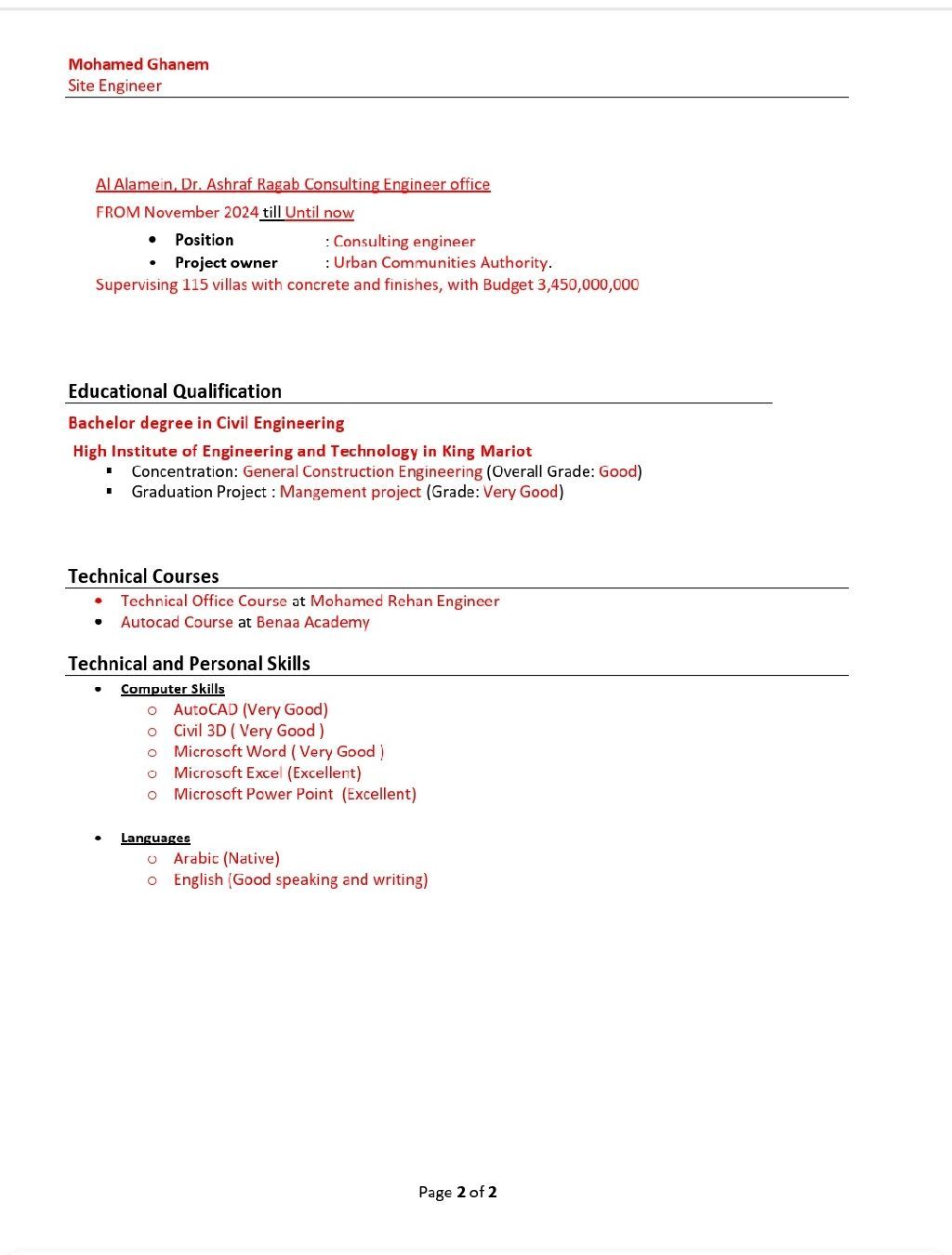 مهندس مدني خبرة 7 سنوات في التنفيذ والاشراف على التنفيذ وعمل المستخلصات وحصر الكميات ومتابعة سير الأعمال لضمان الالتزام بالجداول الزمنية وجودة التنفيذ كما أتمكن من مراجعة المخططات والتنسيق بين جميع التخصصات لضمان سير المشروع بسلاسة كمان أتمكن بفضل الله عز وجل من العمل على برامج (Excel, AutoCAD, Civil 3D)