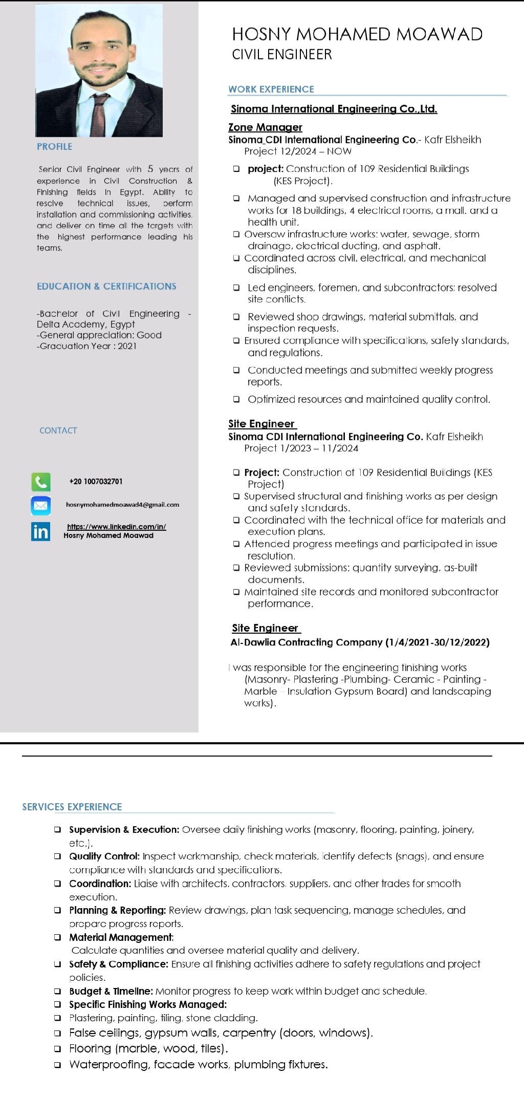 مهندس مدني خبرة 5 سنوات في أعمال التنفيذ والتشطيبات والاشراف على المواقع، داخل مصر وعملت على مشاريع سكنية متميزة مع خبرة قوية في إدارة أعمال التشطيبات بالكامل بالاضافة الى الاشراف على الأعمال الخرسانية وقراءة المخططات وحصر الكميات (BO) جاهز للعمل فورا متواجد في مصر