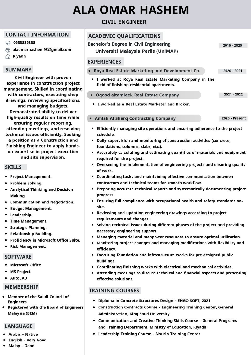 Civil Engineer with practical experience in site supervision and project execution, skilled in coordinating with teams and ensuring work is carried out according to technical standards. Seeking to join a well - established and reputable company in Riyadh where I can contribute my skills and experience to successful project delivery while continuously developing my professional career