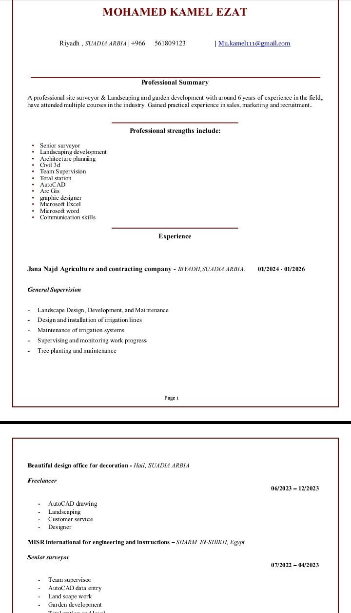 امتلك خبرة في أعمال اللاند سكيب وتطوير الحدائق وسبق العمل في مشاريع الرياض الخضراء لدي القدرة علي ادارة الموقع ومتابعه الأعمال وفق المخططات والمواصفات الفنية مع ضمان تطبيق المعايير الفنيه وحل المشكلات داخل الموقع امتلك خبرة في التصميم علي برنامج AutoCAD وExcel وخبرة بالأعمال المساحية (توتال ستيشن والميزان) متاح للعمل الفوري ونقل الكفالة