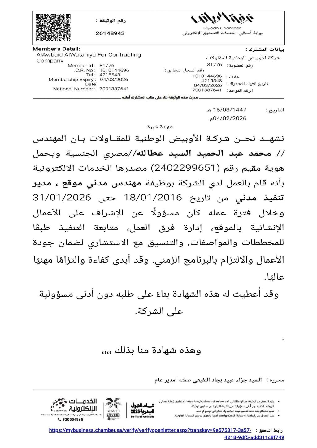 مهندس مدني حاصل على شهادة PMP ® خريج 2013، خبرة أكثر من 13 سنة في تنفيذ وإدارة مشاريع الإنشاءات والبنية التحتية، ومعتمد في العديد من المشاريع الكبرى التابعة لشركة المياه الوطنية (NWC) متمكن في الاشراف الميداني، قيادة فرق العمل، ضمان الجودة، وضمان تسليم المشاريع في الوقت المحدد وفق المعايير الفنية