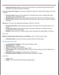 مهندس كهرباء (خريج جامعة الأزهر) متخصص في أنظمة الجهد المنخفض والتيار الخفيف. امتلك خبرة واسعة في مصر في الاشراف الفني، مراجعة المخططات (Shop Drawings) وتنسيق المشاريع الكبرى. متميز في استخدام أدوات الهندسة الرقمية وإدارة المخططات التنفيذية بدقة متناهية لضمان تسليم المشاريع وفق الجدول الزمني