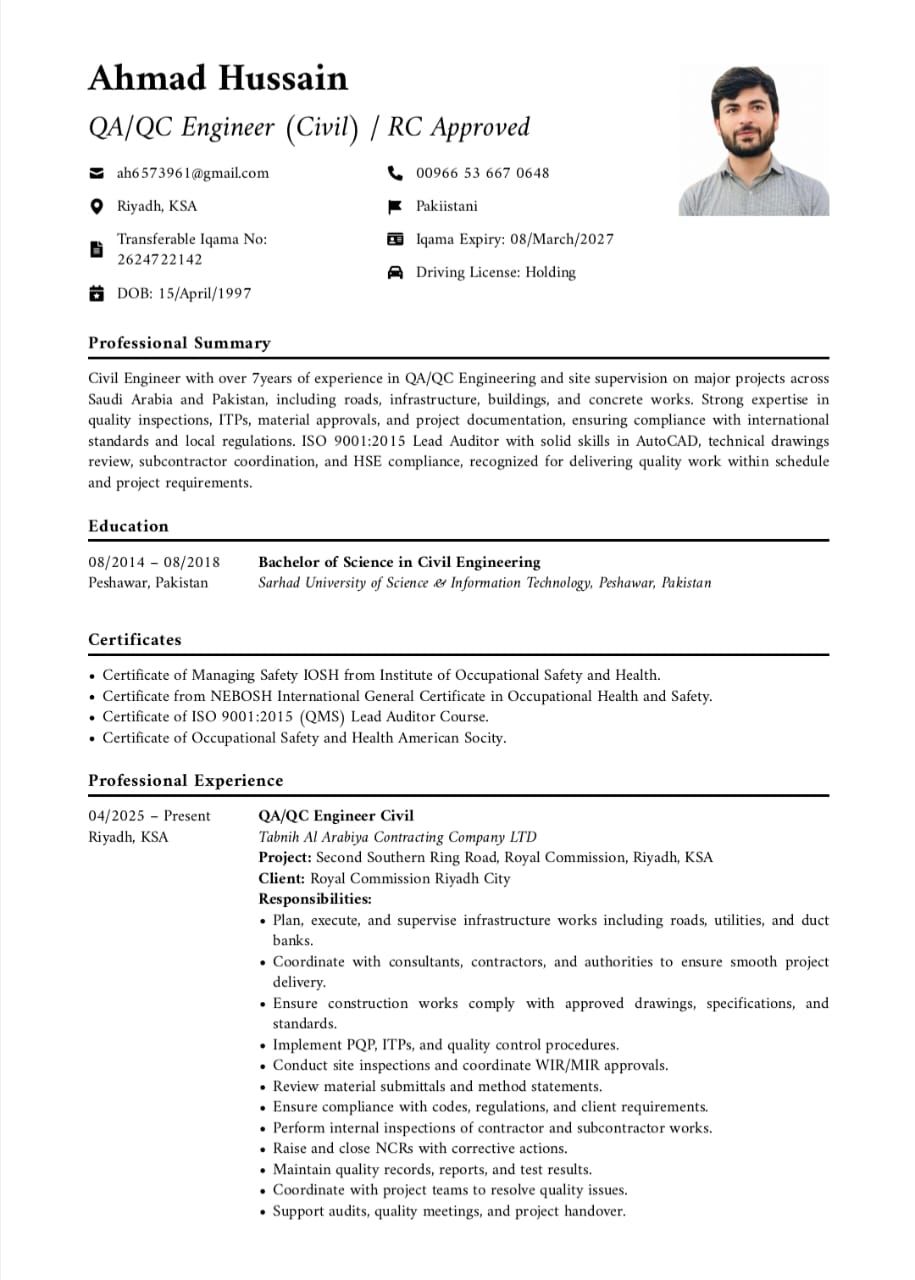 I am writing to apply for the position of Civil Site Engineer. I have over seven years of total experience in the construction industry, including four years of experience in the Kingdom of Saudi Arabia as a Civil Site Engineer, one year of experience as a QA/ QC Civil Engineer, and more than two years of experience in Pakistan as a Civil Engineer and Civil Site Engineer