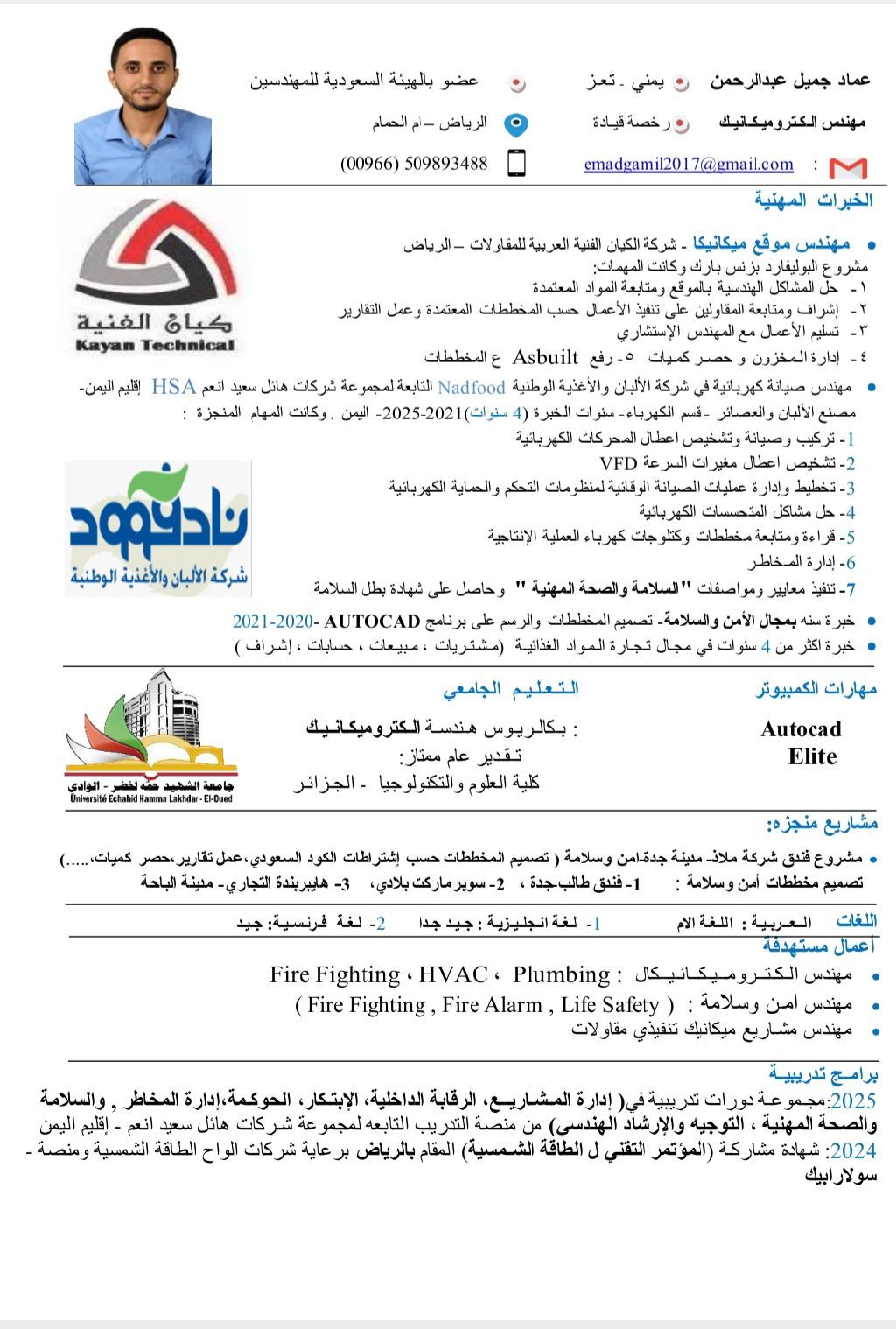 م. عماد جميل من اليمن، حاليا اعمل مهندس موقع ميكانيكا مشروع البولفار بزنس بارك - الرياض (Plumbing, Duct, Chilled pipe, Fire) أيضا عندي خبرة بالهندسة الكهربائية 5 سنوات، التخصص الجامعي هندسة كهروميكانيك - دولة الجزائر)