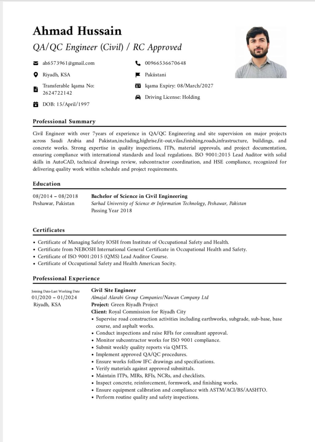 Dear Hiring Manager, I am writing to apply for the position of Civil Site Engineer. I have over seven years of total experience in the construction company, including four years of experience in the Kingdom of Saudi Arabia as a Civil Site Engineer, one year of experience as a QA/ QC Civil Engineer, and more than two years of experience in Pakistan as a Civil Engineer and Civil Site Engineer. I have