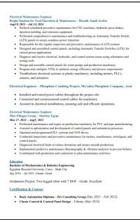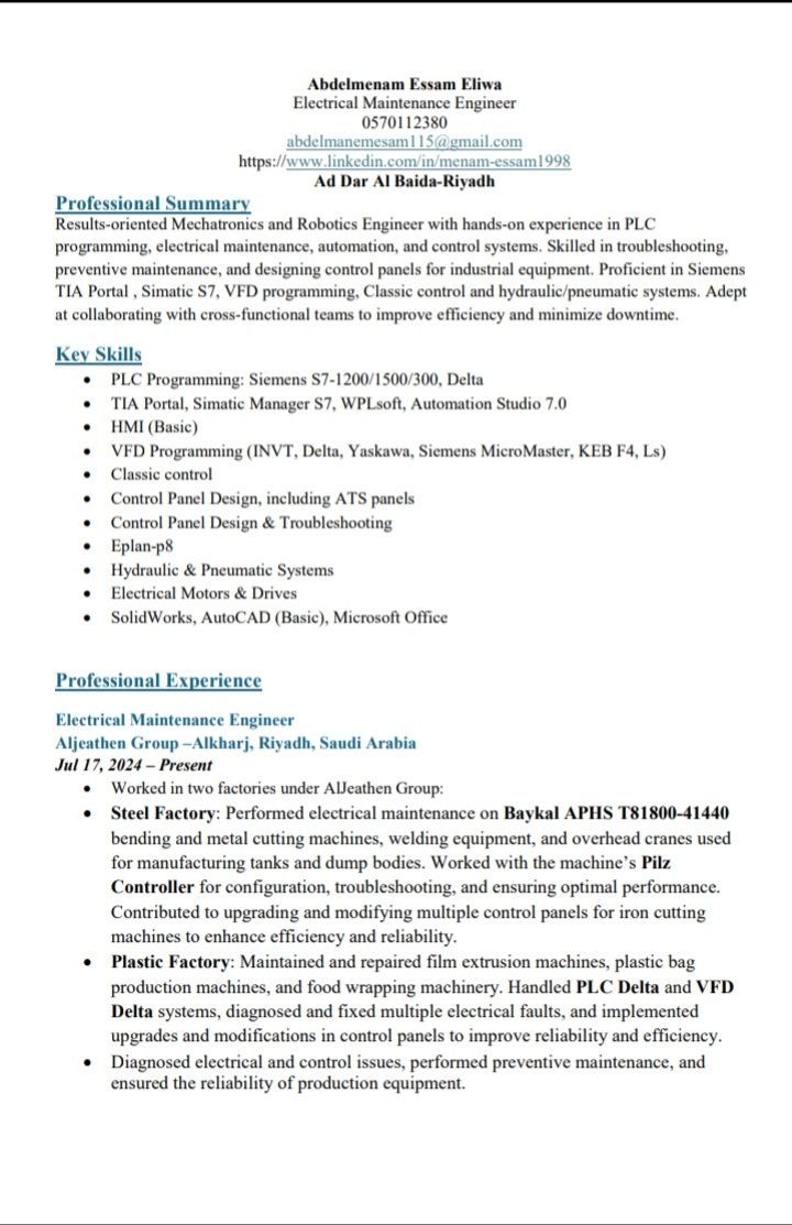 مهندس كهرباء صيانة وتشغيل ابحث عن عمل خبرة عملية تزيد عن أربع سنوات في مجال الصيانة والكنترول خبرة داخل المملكة ثلاث سنوات متاح نقل كفالة / ابحث عن عمل في مجال المصانع أو شركات المقاولات مهندس صيانة وتشغيل