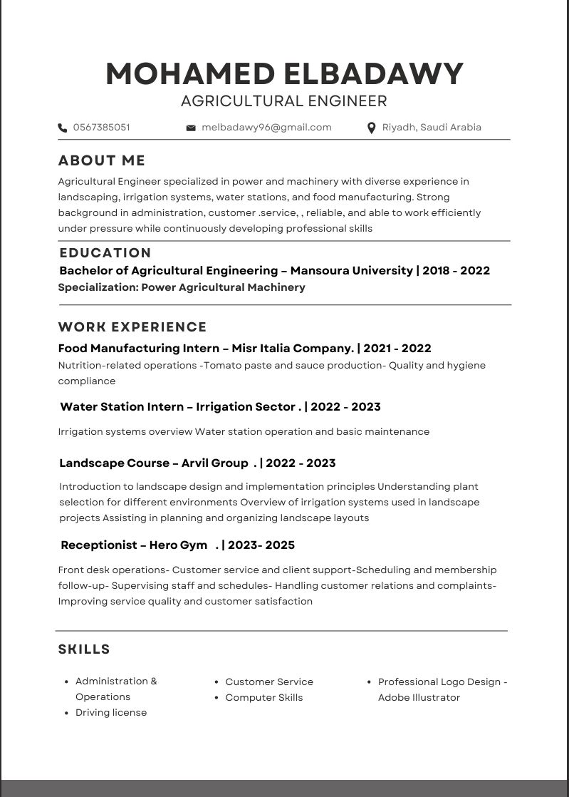 مهندس زراعي متخصص في هندسة القوى والآلات الزراعية، امتلك خبرة عملية في أنظمة الري، تشغيل محطات المياه، تصنيع الأغذية، والتنسيق الزراعي (اللاند سكيب) لدي خلفية قوية في الإدارة وخدمة العملاء، وأتميز بالقدرة على العمل تحت الضغط وتحسين جودة الخدمات التشغيلية. بكالوريوس هندسة زراعية - جامعة المنصورة خبرة في تشغيل وصيانة محطات المياه خبرة في تصنيع المنتجات الغذائية ومراقبة الجودة معرفة بأنظمة الري ومشروعات