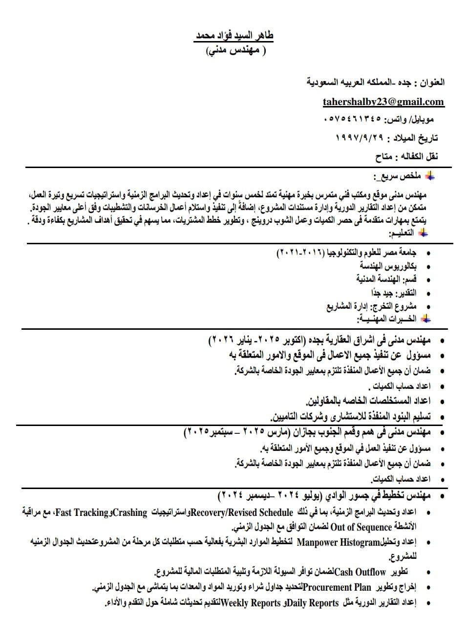 مهندس موقع مدني بخبرة 5 سنوات في كبرى شركات المقاولات والتطوير العقاري في مصر والسعودية. عملت بميناء جازان وجدة في الاشراف على التنفيذ والتطوير العقاري وحصر الكميات واستلام وتسليم البنود مع الاستشاري، اضافة لخبرة في المكتب الفني والتخطيط واعداد الجداول الزمنية والمستخلصات لمشاريع الشركة الوطنية للمياه ومشاريع التراث في الرياض