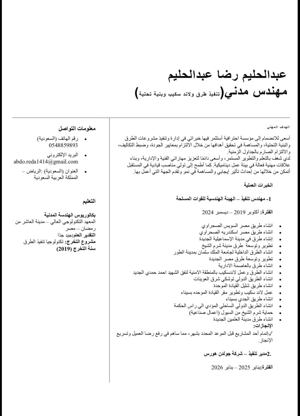 مهندس مدني تنفيذ طرق وبنية تحتية ولاند سكيب وانشاءات (شخصية قيادية لادارة المشروعات والتنسيق بين المالك والاشتشاري) خبرة فعليه 7 سنوات متواجد في الرياض وجاهز للعمل مصري الجنسية