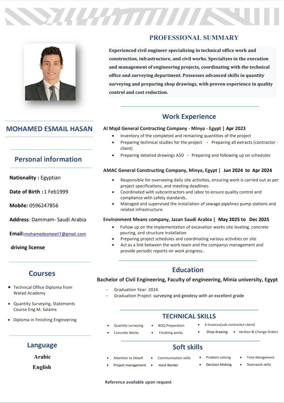 مهندس مدني خبرة سنتين وسنة بالمملكة في أعمال المكتب الفني (حصر الكميات - الجداول الزمنية - اعداد المستخلصات) وخبرة أيضا في أعمال التنفيذ جاهز للعمل متواجد حاليا في الدمام إقامة سارية - وامتلك رخصة قيادة