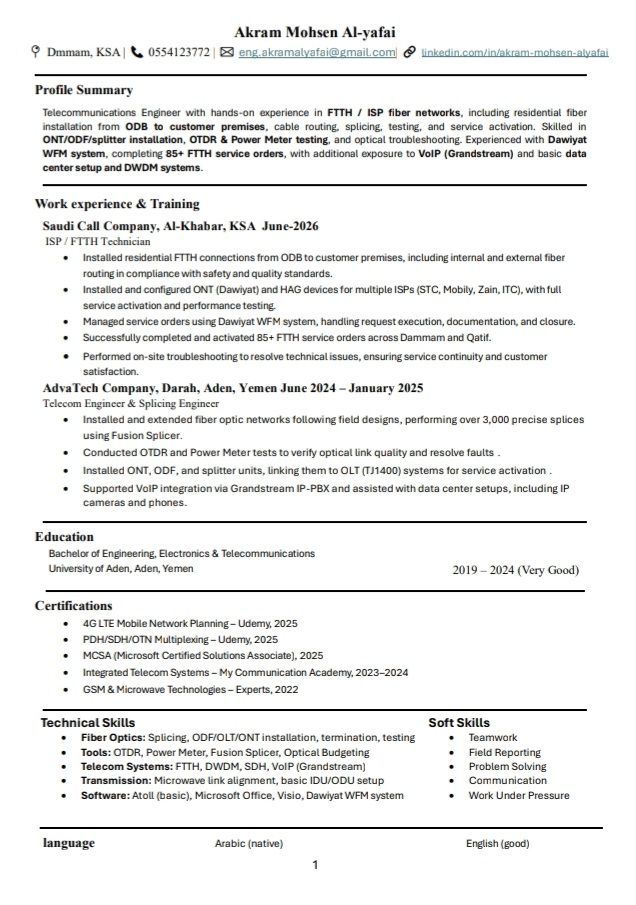مهندس اتصالات وفني FTTH بخبرة عملية في شبكات الألياف الضوئية وISP. متخصص في تمديد الألياف، اللحام، الفحص (OTDR & Power Meter) تركيب ONT / ODF/ Splitter، وتفعيل الخدمات عبر WFM. خبرة في حل الأعطال الميدانية والعمل تحت الضغط. ابحث عن فرصة عمل مناسبة داخل المملكة