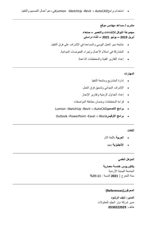 مهندس موقع ومدير مشروع تطوير عقاري بخبرة قوية في متابعة التنفيذ، الاشراف على فرق العمل إدارة المشاريع، واعداد الجداول الزمنية، أسعى للانضمام الى مؤسسة محترفة لتطبيق خبرتي في مشاريع التطوير العقاري في الرياض وتحقيق أعلى مستويات الجودة والالتزام بالمواعيد