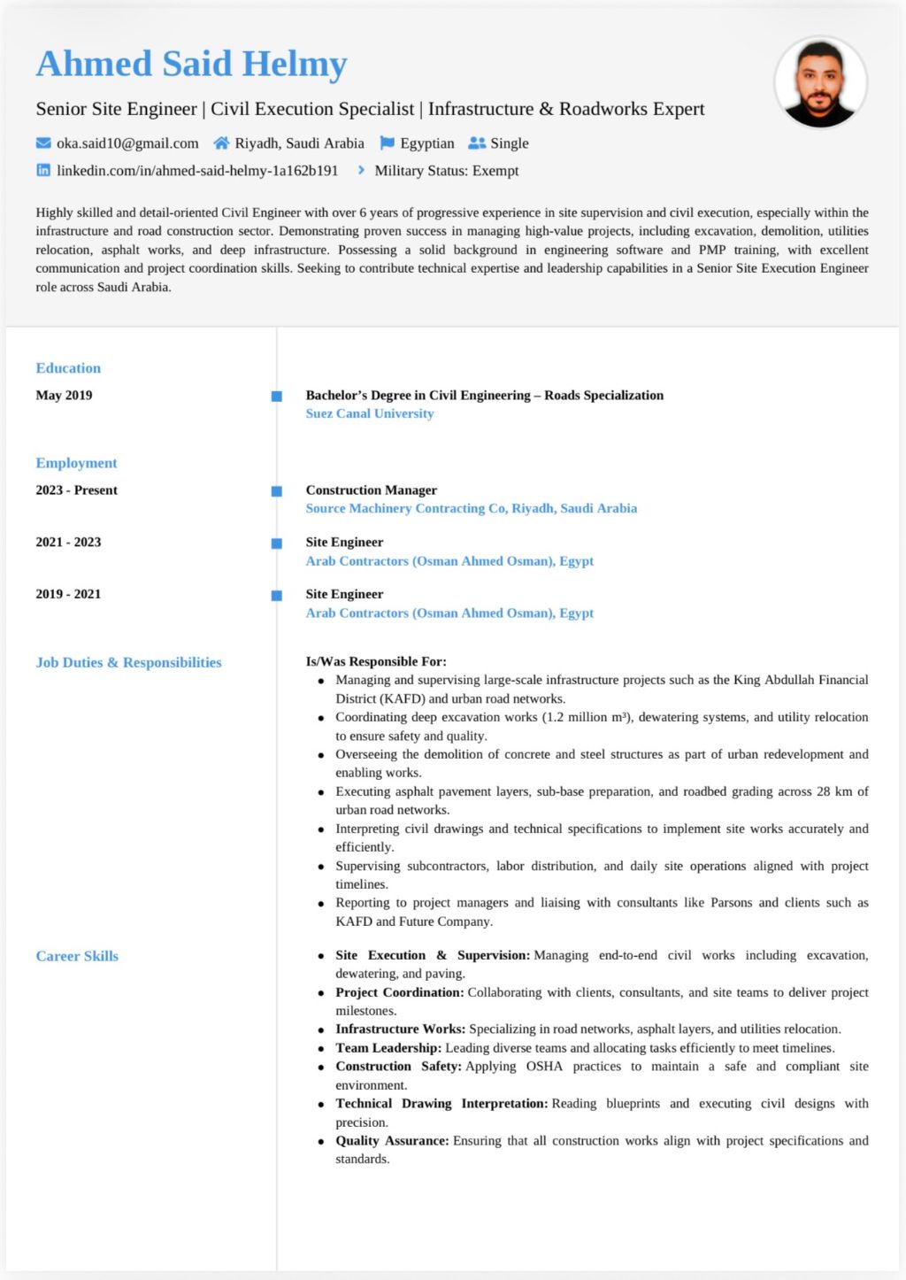 مهندس مدني خبرة في الموقع 7 سنوات لأعمال الانشاءات والتشطيبات والحفر وعلي دراية بأعمال التصميم الانشائي عن طريق برنامج sap2000 وبرنامج AutoCAD وموجود حاليا في الرياض وأرغب في عمل مع شركة مستقره