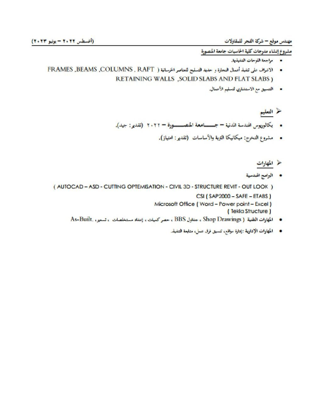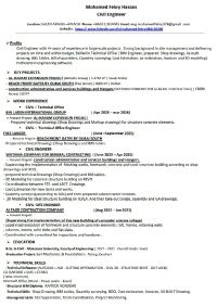 مهندس مدني خبرة 4 سنوات في مشروعات كبرى (مثل الحرم المكي) خبرة في إدارة المواقع وتسليمها طبقا للجدول الزمني ومواصفات البنود BOQ احتراف أعمال المكتب الفني (احتراف تقنية "Revit" BIM، الحصر، التسعير، اعداد BOQ، المستخلصات، عمل لوحات shop drawing, As - built, عمل coordination بين الأقسام المختلفة) اجادة البرامج الهندسية والتصميمية (CAD, ASD, Revit, cutting optimization, tekla, civil 3D, ETABS, Safe)