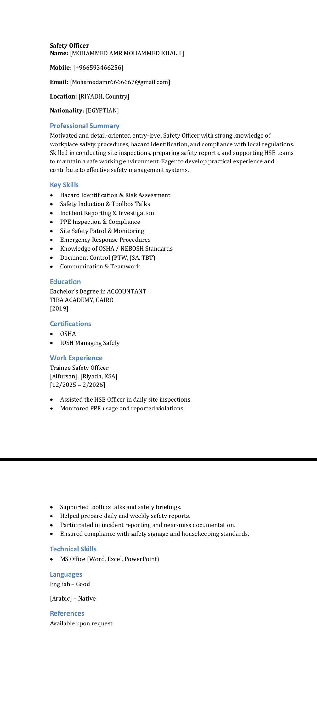 ابحث عن فرصة عمل في مجال السلامة، جاهز للعمل فورا ولدي رغبة قوية في التعلم والتطور مهارة المايكروسوفت أوفيس اكسل وورد بوربوينت اكسس تقديم تقيم مخاطر وتقرير يوميه تقرير شهريه