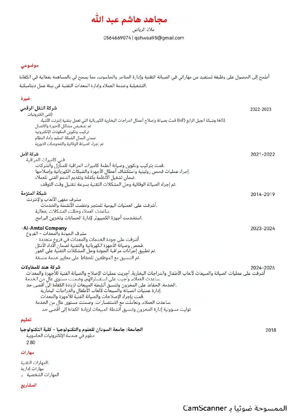 مهندس الكترونيات سوداني الجنسية العمر 30 سنة. عملت في مجال الجودة ومجال كاميرات المراقبة وإدارة محل ألعاب، وصيانة ألعاب الاطفال وغيرها مجالات الكترونية متعددة أتقن قيادة جميع السيارات. عندي أقامه ورخصة سارية وكفالة وسكن في الرياض، وأقدر امتلك سيارة