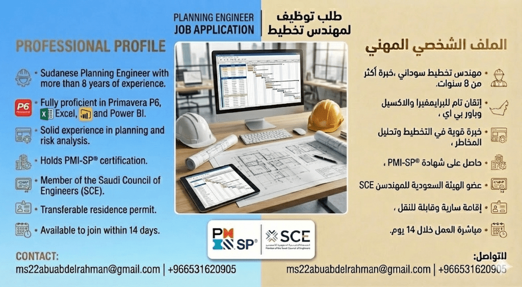 مهارات قوية في التخطيط، إدارة المشاريع، وجدولة الأعمال في مجال الهندسة. خبرة في استخدام أدوات مثل Microsoft Power BI وPrimavera 6 وExcel. يشغل حاليا وظيفة مهندس تخطيط، مع خبرة سابقة كمهندس موقع. سجل حافل في العمل مع مؤسسات مرموقة مثل وزارة البنية التحتية والنقل وشركة الفايز للتشييد