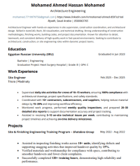 مهندس معماري خريج (2023) اشتغلت مهندس موقع تشطيبات سنتين للفلل السكنيه الفاخره & اشتغلت في مكتب استشاري في جدة لدي خبرة في اعداد المخططات المعماريه والتصميم الداخلي والخارجي وتطبيق الكود السعودي للبناء أجيد استخدام البرامج الهندسيه AutoCAD & Revit & 3ds Max & V-Ray corona & Lumion & Photoshop & office