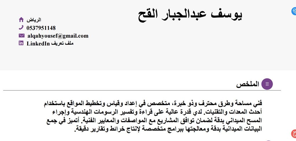 مساح/ مساعد مساح (Total Station/ GPS/ Level) مساح ميداني بخبرة سنة في اليمن، الى جانب تدريب عملي لمدة شهرين في المملكة العربية السعودية على استخدام الاجهزة المساحية الحديثة وتنفيذ أعمال الرفع المساحي بدقة. امتلك أساسا قويا في تشغيل اجهزة Total Station و GPS و Level مع القدرة على العمل كمساح أو مساعد مساح بكفاءة عالية ضمن فرق العمل الهندسية. أبرز المهارات تنفيذ أعمال الرفع المساحي