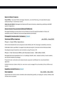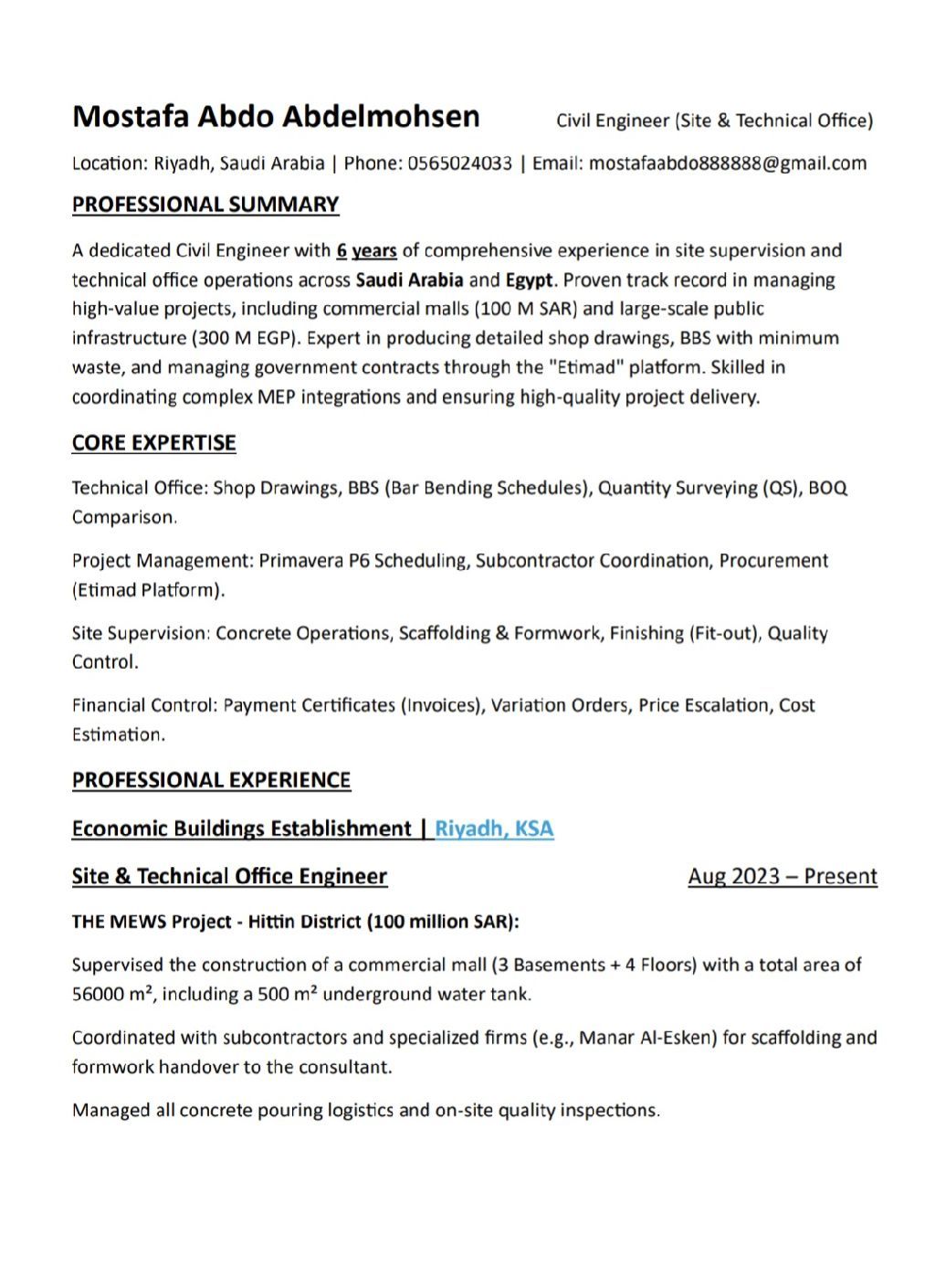 مهندس مدني متواجد في الرياض إقامة سارية نقل كفالة رخصة قيادة لدى القدرة على استخدام برامج التصميم والمكتب الفني وعمل الحدول الزمني باستخدام برنامج البريما فيرا امتلك خبرة تتجاوز 6 سنوات في قطاع الإنشاءات بين المملكة العربية السعودية ومصر. خلال مسيرتي المهنية، نجحت في إدارة الجوانب الفنية والتنفيذية لمشاريع كبرى، من أبرزها مشروع "ذا ميوز" في الرياض بقيمة 100 مليون ريال