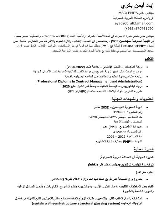 مهندس مدني خبرة 6 سنوات في مجال الإنشاءات حاصل علي ماجستير تحليل انشاءات وشهادته pmp ومعتمد من هيئة المهندسين السعودية