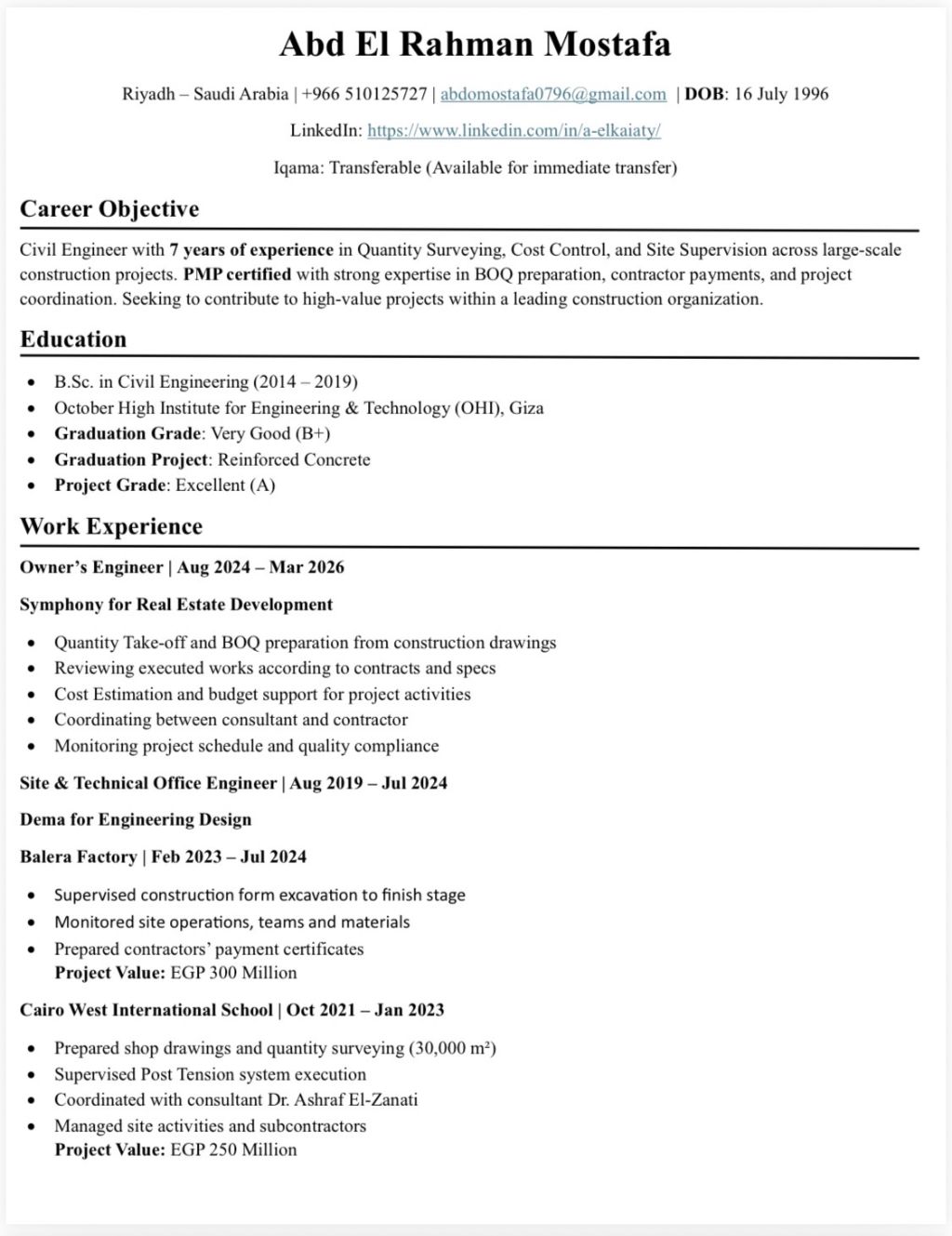 مهندس مدني خبرة 7 سنوات اشراف وتنفيذ ومكتب فني - متاح نقل كفالة - مسجل بالهيئة السعودية للمهندسين حاصل على شهادة PMP