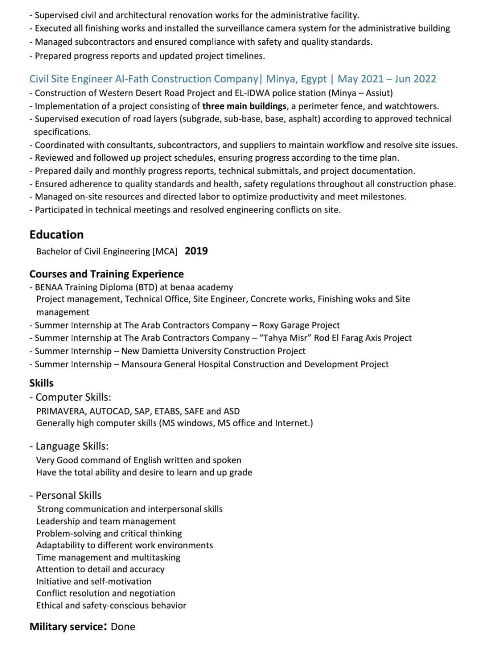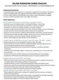 مهندس مدني بخبرة 7 سنوات في أعمال التنفيذ الخرساني والتشطيبات، عملت في مشروعات سكنية وقادر على إدارة الموقع من البداية حتى التسليم طبقا للمخططات والمواصفات المعتمدة. المهام والقدرات الاشراف الكامل على أعمال التنفيذ بالموقع متابعة المقاولين والعمال وضبط الجودة استلام الأعمال الخرسانية والتشطيبات حصر الكميات واعداد التقارير الالتزام بالبرامج الزمنية اجادة البرامج AutoCAD - Excel - Word - Microsoft