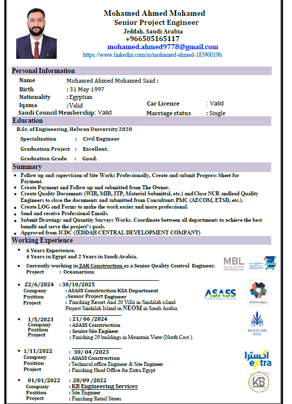 ابحث عن فرصة عمل - مهندس مدني (تنفيذ وجودة ومكتب فني وتخطيط) خبرة 6 سنوات بالمملكة (خبرة في مشاريع كبيرة نيوم وجدة) ومصر حاصل علي اعتماد هيئة المهندسين السعوديين (SCE) رخصة قيادة سارية - اجادة تامة للغة الانجليزية والمراسلات الرسمية